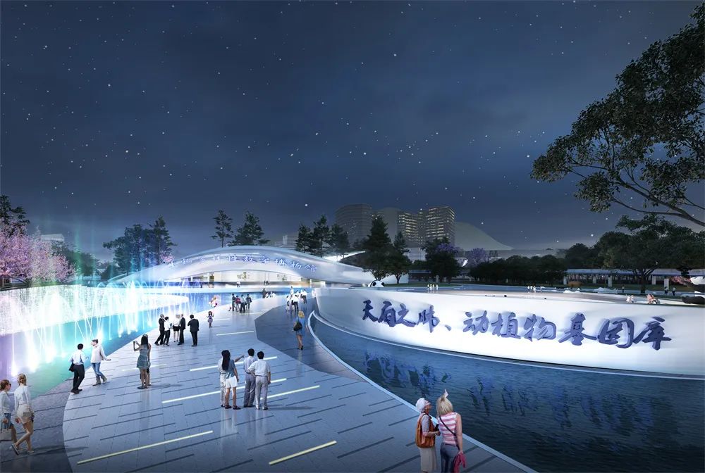 設(shè)計(jì)環(huán)形人行天橋,猶如一朵盛開的嬌艷的花,有機(jī)聯(lián)系起項(xiàng)目的南北地塊,同時(shí)兼顧新區(qū) 大道的人行過街功能,結(jié)合燈光藝術(shù)營造,也將成為該片區(qū)一個(gè)標(biāo)志性的打卡點(diǎn),象征著雅安因多樣而美麗,因共生而繁盛;颦h(huán)圍欄展示雅安特色物種。地面燈光按植物花色進(jìn)行分段布置,同時(shí)通過投影設(shè)備和交互式燈光等設(shè)施,增加游人體驗(yàn)感。環(huán)形橋跨越機(jī)動(dòng)車道,基因環(huán)的出現(xiàn)開始了生物密碼的探索之旅。