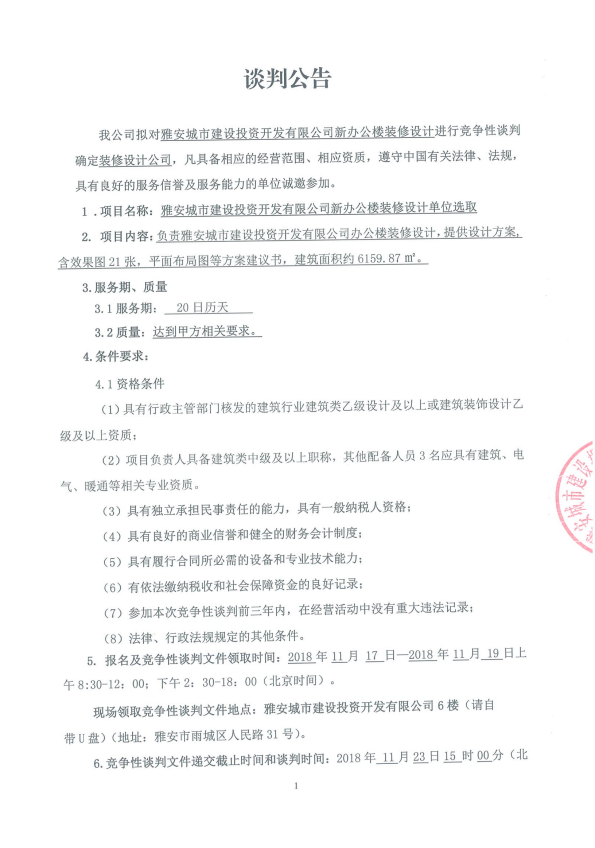 雅安城市建設(shè)投資開(kāi)發(fā)有限公司新辦公樓裝修設(shè)計(jì)方案競(jìng)爭(zhēng)性談判