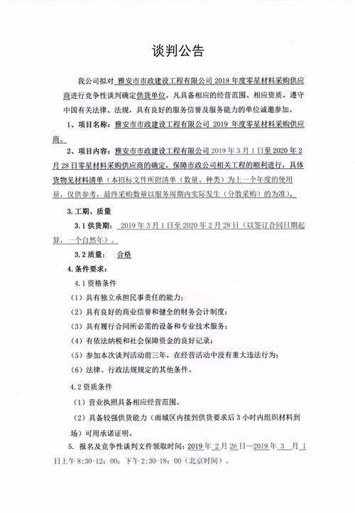 雅安市市政建設(shè)工程有限公司2019年度零星材料采購(gòu)供應(yīng)商競(jìng)爭(zhēng)性談判公告