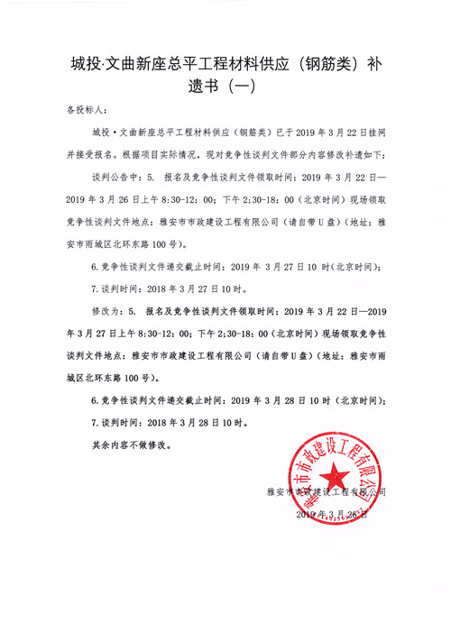 城投·文曲新座總平工程材料供應(yīng)(鋼筋類)競(jìng)爭(zhēng)性談判公告補(bǔ)遺一