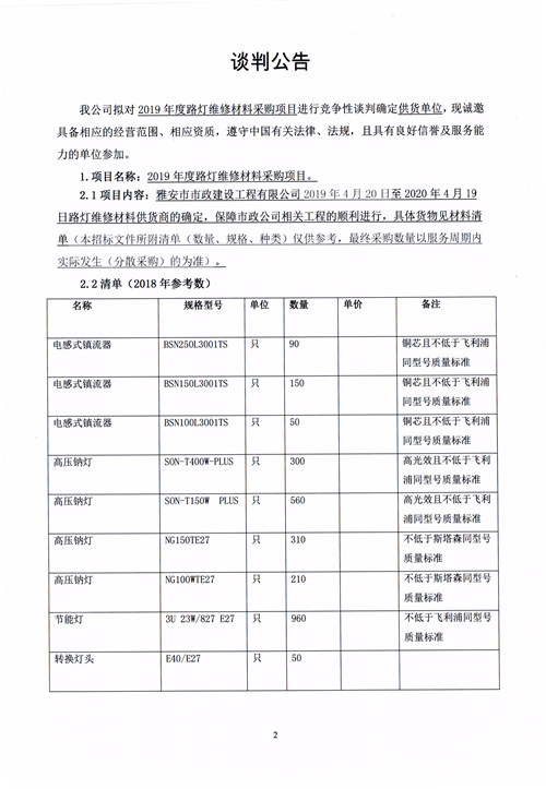 市政公司2019年度路燈維修材料采購(gòu)項(xiàng)目競(jìng)爭(zhēng)性談判公告