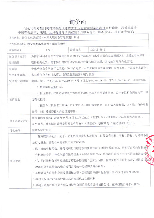 雅安城利水電開發(fā)有限責(zé)任公司禁門關(guān)電站編寫《水庫大壩應(yīng)急管理預(yù)案》競爭性談判公告