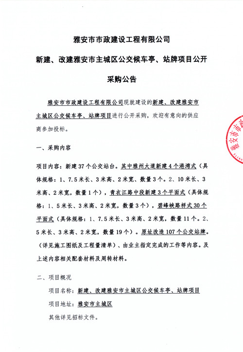 新建、改建雅安市主城區(qū)公交候車(chē)亭、站牌項(xiàng)目公開(kāi)采購(gòu)公告