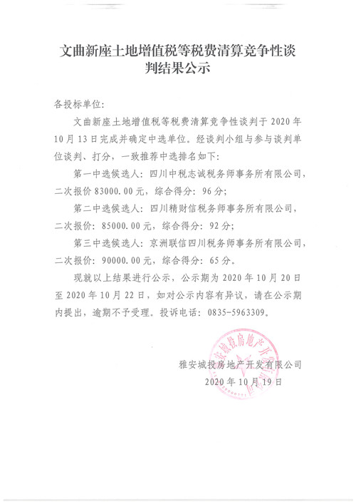 文曲新座土地增值稅等稅費清算競爭性談判結(jié)果公示