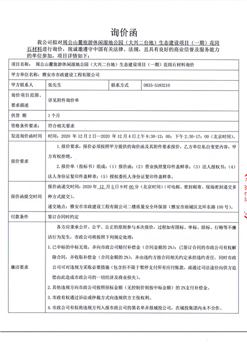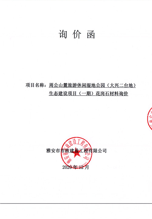市政公司 周公山麓旅游休閑濕地公園(大興二臺(tái)地)生態(tài)建設(shè)項(xiàng)目(一期)花崗石材料詢(xún)價(jià)函
