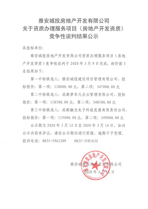 城投地產(chǎn)公司關(guān)于資質(zhì)辦理服務(wù)項(xiàng)目(房地產(chǎn)開(kāi)發(fā)資質(zhì))競(jìng)爭(zhēng)性談判結(jié)果公示