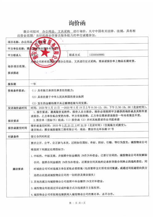 城投物業(yè)公司辦公用品、文具采購詢價函