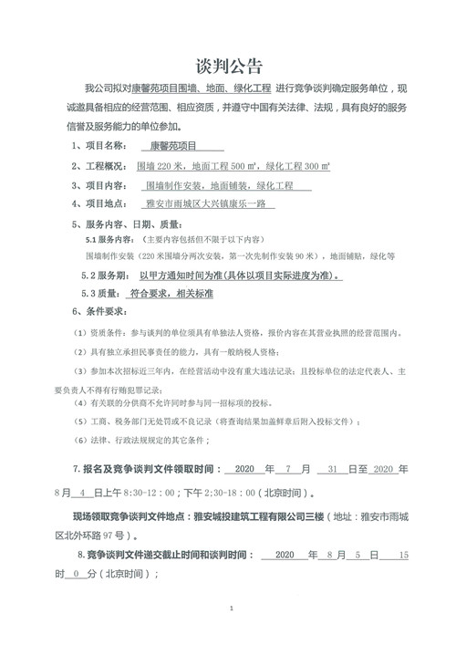 城投建工公司康馨苑項(xiàng)目圍墻、地面、綠化工程競(jìng)爭(zhēng)性談判公告