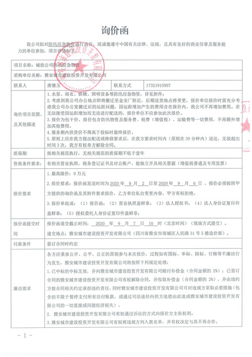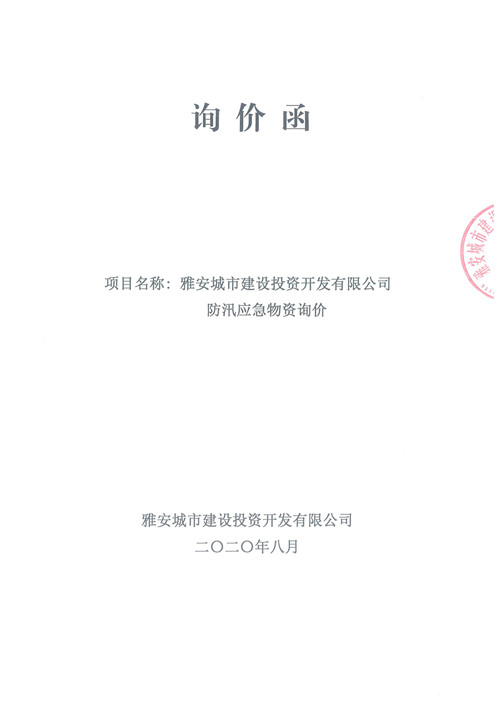 雅安城市建設(shè)投資開發(fā)有限公司防汛應(yīng)急物資詢價函