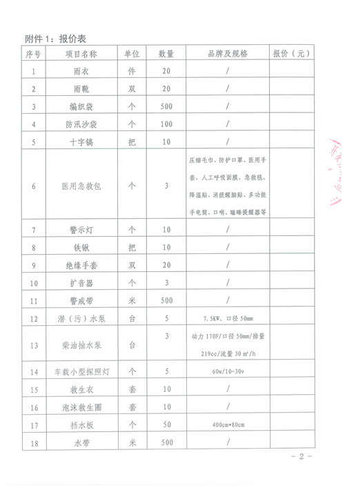 防汛應(yīng)急物資詢價函