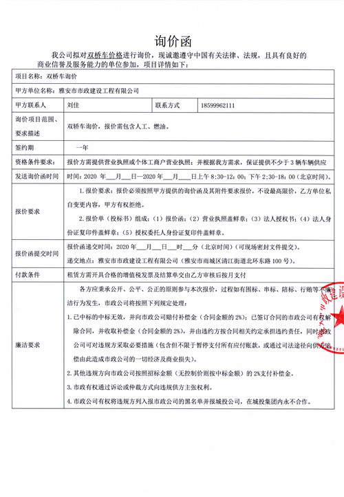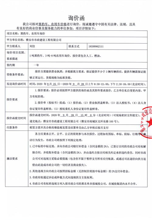 市政公司黑豹車、農用車、雙橋車價格詢價函