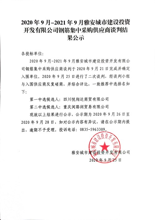 2020年9月—2021年9月雅安城市建設(shè)投資開發(fā)有限公司鋼筋集中采購供應(yīng)商談判結(jié)果公示