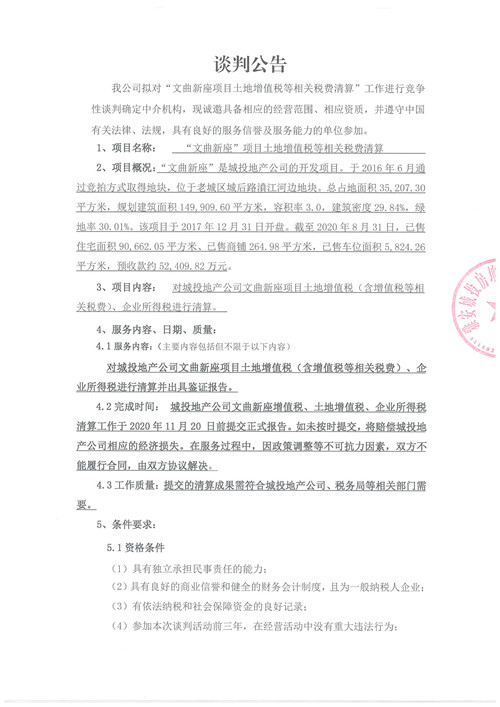 城投房地產(chǎn)公司“文曲新座項(xiàng)目土地增值稅等相關(guān)稅費(fèi)清算”工作競爭性談判公告