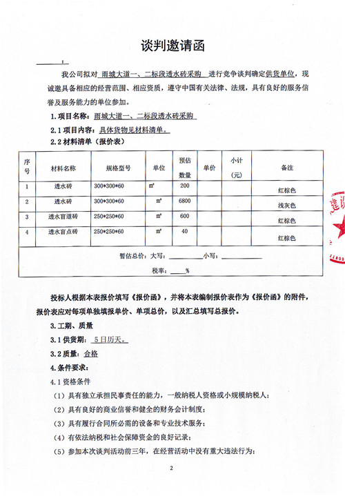 市政公司雨城大道一、二標(biāo)段透水磚采購競爭性談判公告