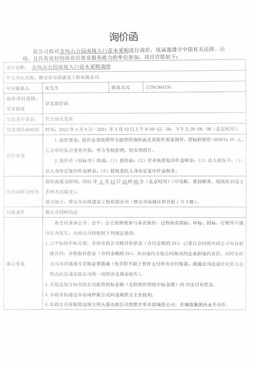 雅安市政公司金鳳山公園南坡入口苗木采購詢價(jià)函