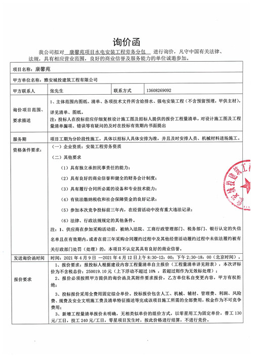 城投建工公司項目水電安裝工程勞務分包詢價函