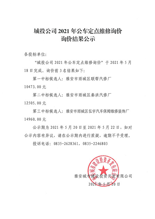 城投公司2021年公車(chē)定點(diǎn)維修詢(xún)價(jià)詢(xún)價(jià)結(jié)果公示