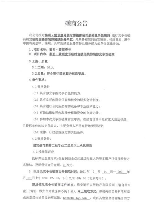 黎明人居公司黎明·蒙頂壹號臨時售樓部裝飾裝修競爭性磋商公告