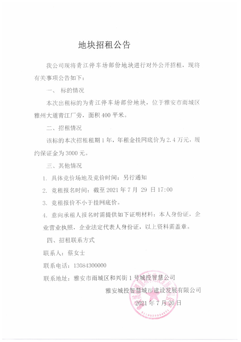 城投智慧公司青江停車場部分地塊招標公告(400㎡)