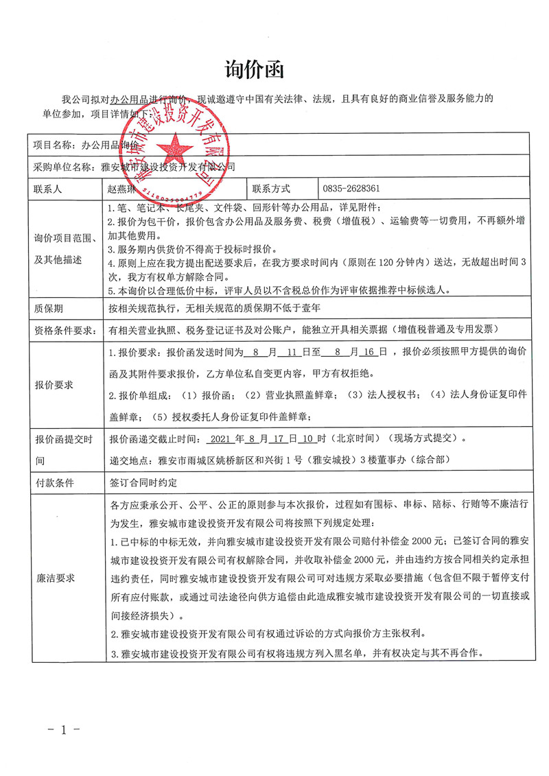 城投公司辦公用品詢價(jià)函