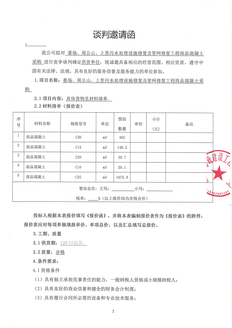 晏場、周公山、上里污水處理設施修復及管網(wǎng)修復工程商品混凝土采購競爭性談判公告