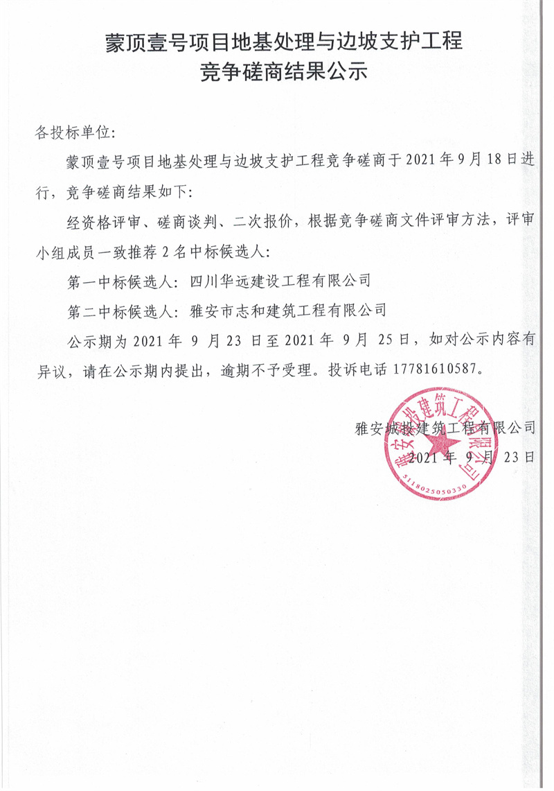 蒙頂壹號基礎(chǔ)抗浮錨桿及基坑支護(hù)工程競爭磋商結(jié)果公示
