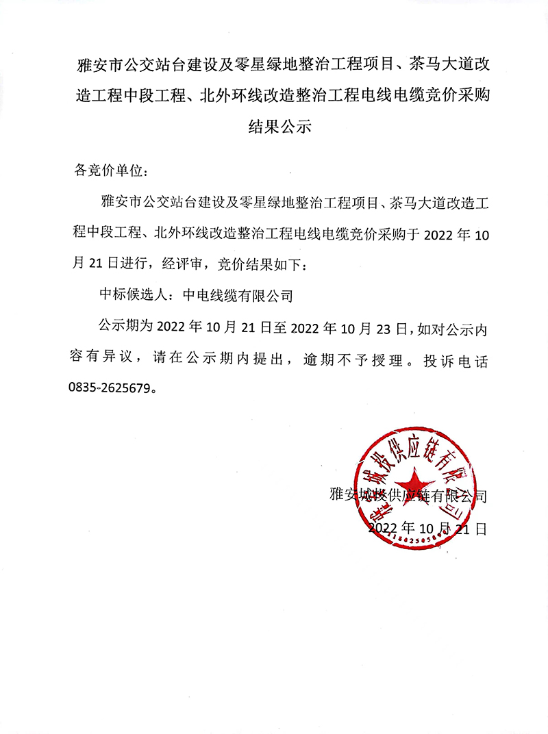 雅安市公交站臺建設及零星綠地整治工程項目、茶馬大道改造工程中段工程、北外環(huán)線改造整治工程電線電纜采購競價結果公告