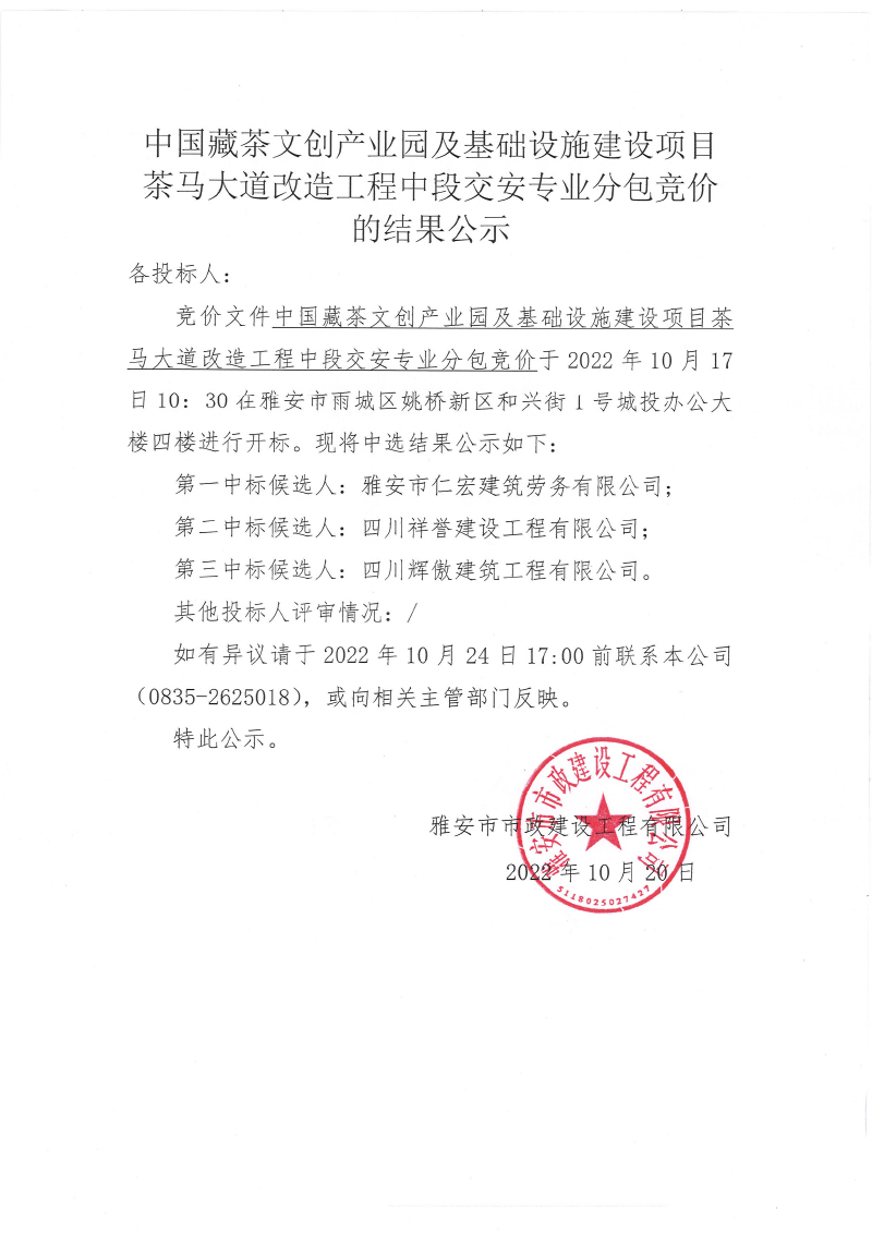 中國藏茶文創(chuàng)產(chǎn)業(yè)園及基礎(chǔ)設(shè)施建設(shè)項目茶馬大道改造工程中段交安專業(yè)分包競價的結(jié)果公示