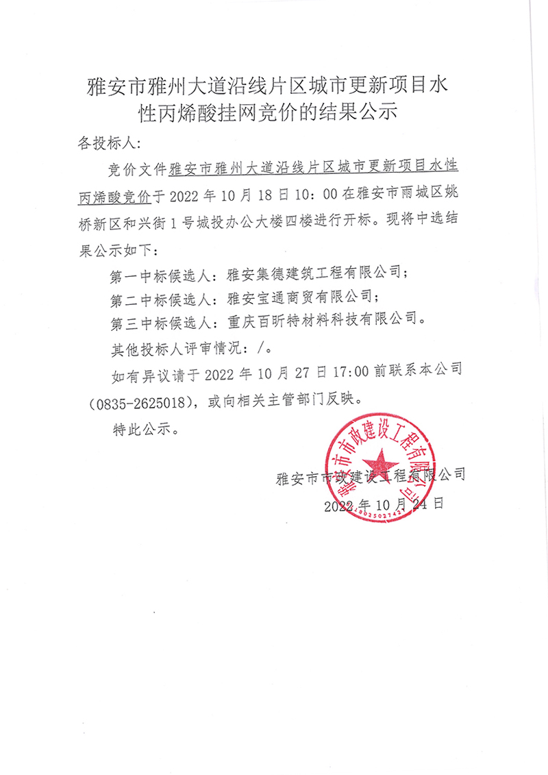 雅安市雅州大道沿線片區(qū)城市更新項(xiàng)目水性丙烯酸掛網(wǎng)競(jìng)價(jià)的結(jié)果公示