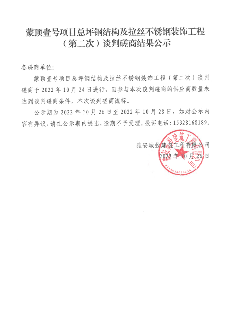 蒙頂壹號(hào)項(xiàng)目總坪鋼結(jié)構(gòu)及拉絲不銹鋼裝飾工程(第二次)談判磋商結(jié)果公示