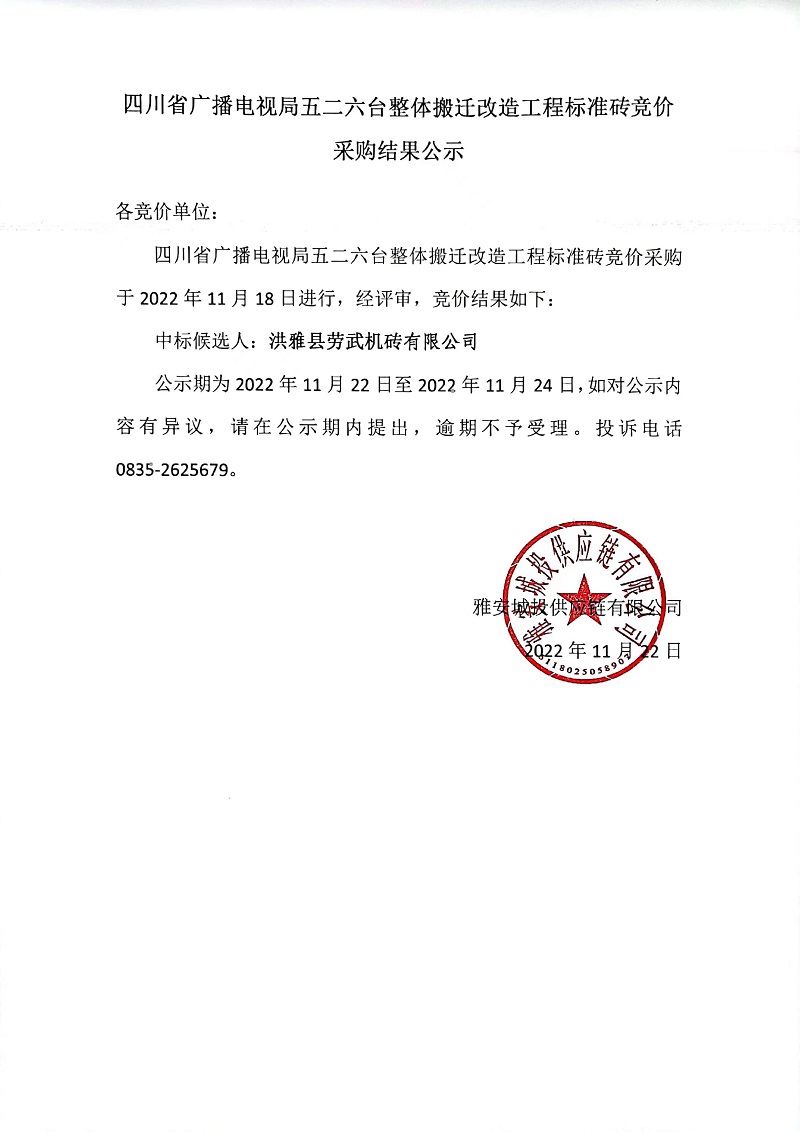 四川省廣播電視局五二六臺(tái)整體搬遷改造工程標(biāo)準(zhǔn)磚競(jìng)價(jià)采購(gòu)結(jié)果公示