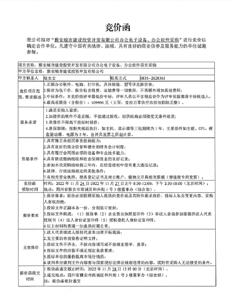 雅安城市建設(shè)投資開(kāi)發(fā)有限公司辦公電子設(shè)備、辦公軟件項(xiàng)目采購(gòu)競(jìng)價(jià)公告