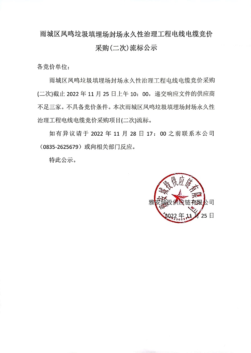 雨城區(qū)鳳鳴垃圾填埋場(chǎng)封場(chǎng)永久性治理工程電線電纜競(jìng)價(jià)采購(gòu)(二次)流標(biāo)公示
