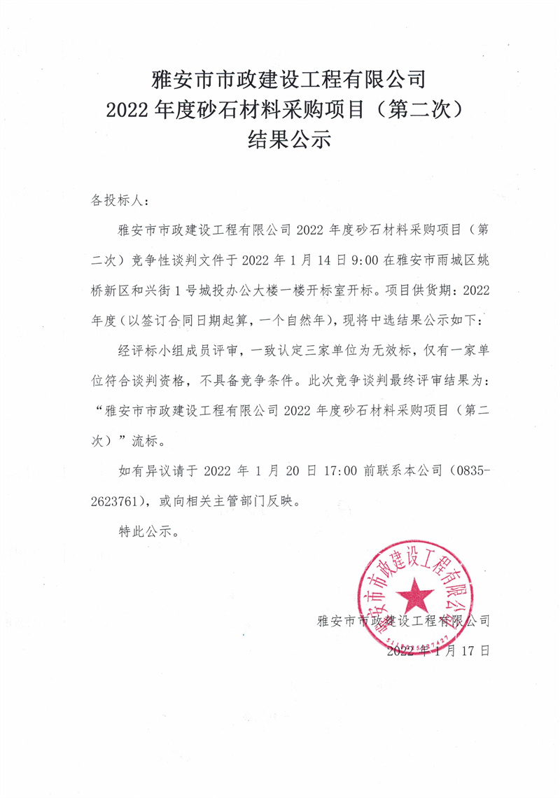 雅安市市政建設(shè)工程有限公司2022年度砂石材料采購項目(第二次)結(jié)果公示