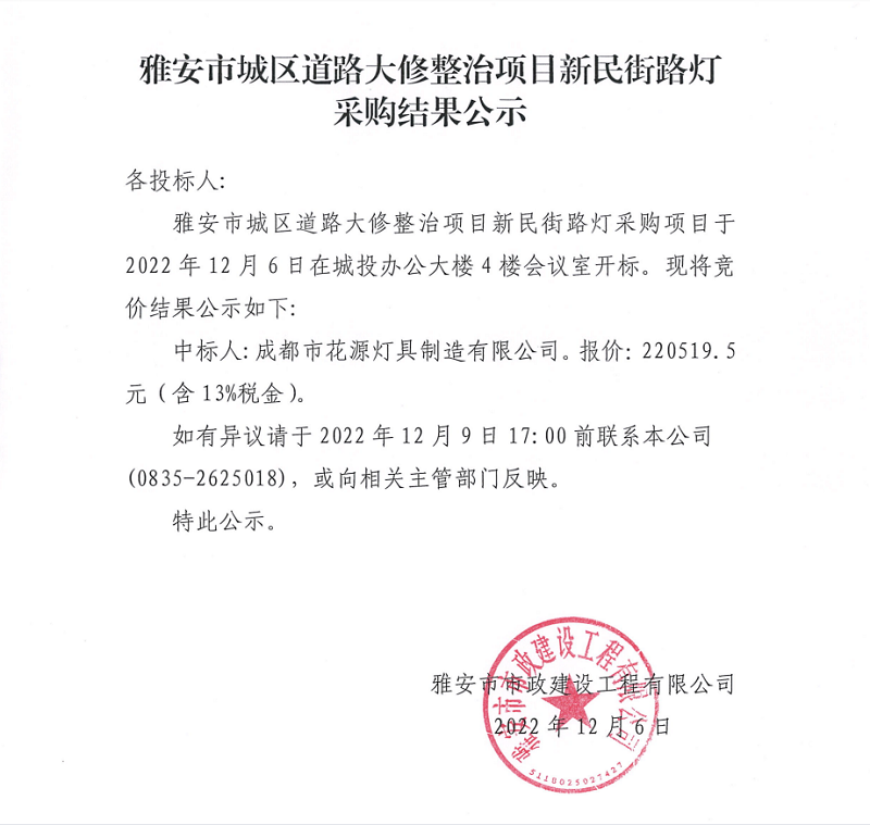 雅安市城區(qū)道路大修整治項目新民街路燈采購結果公示