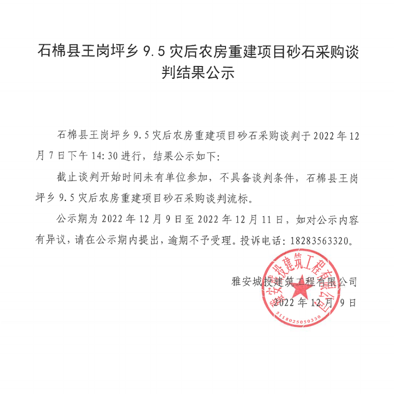 石棉縣王崗坪鄉(xiāng)9.5災后農(nóng)房重建項目砂石采購談判結(jié)果公示