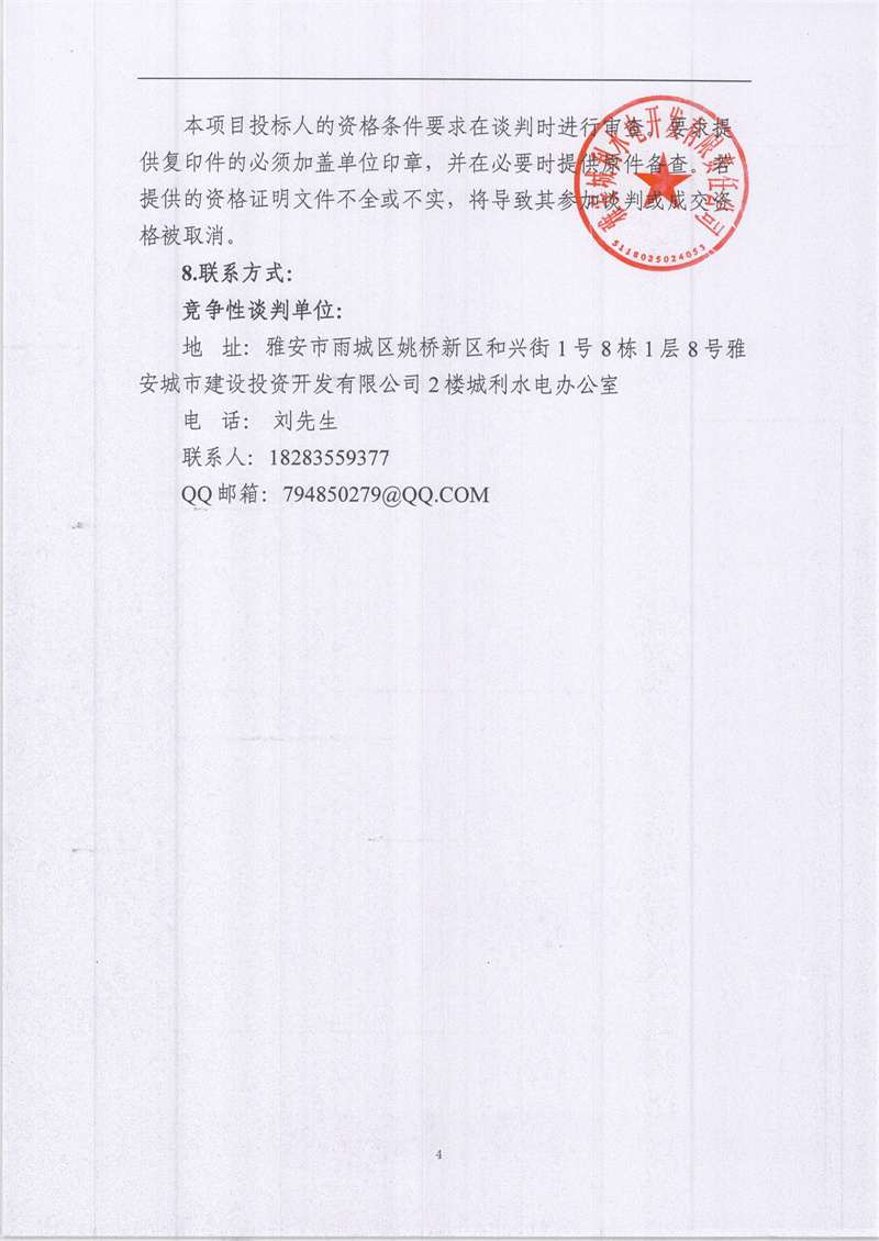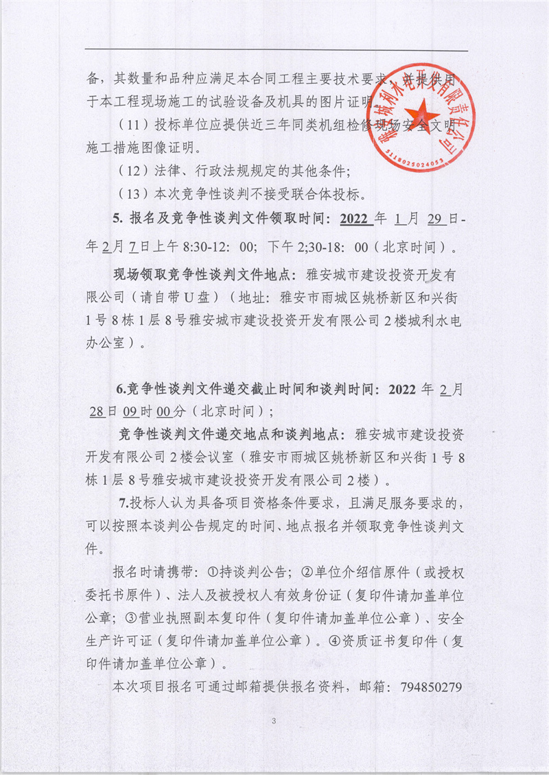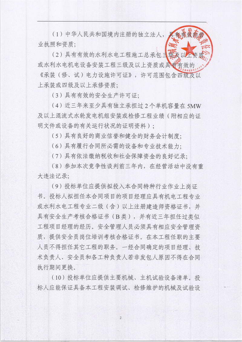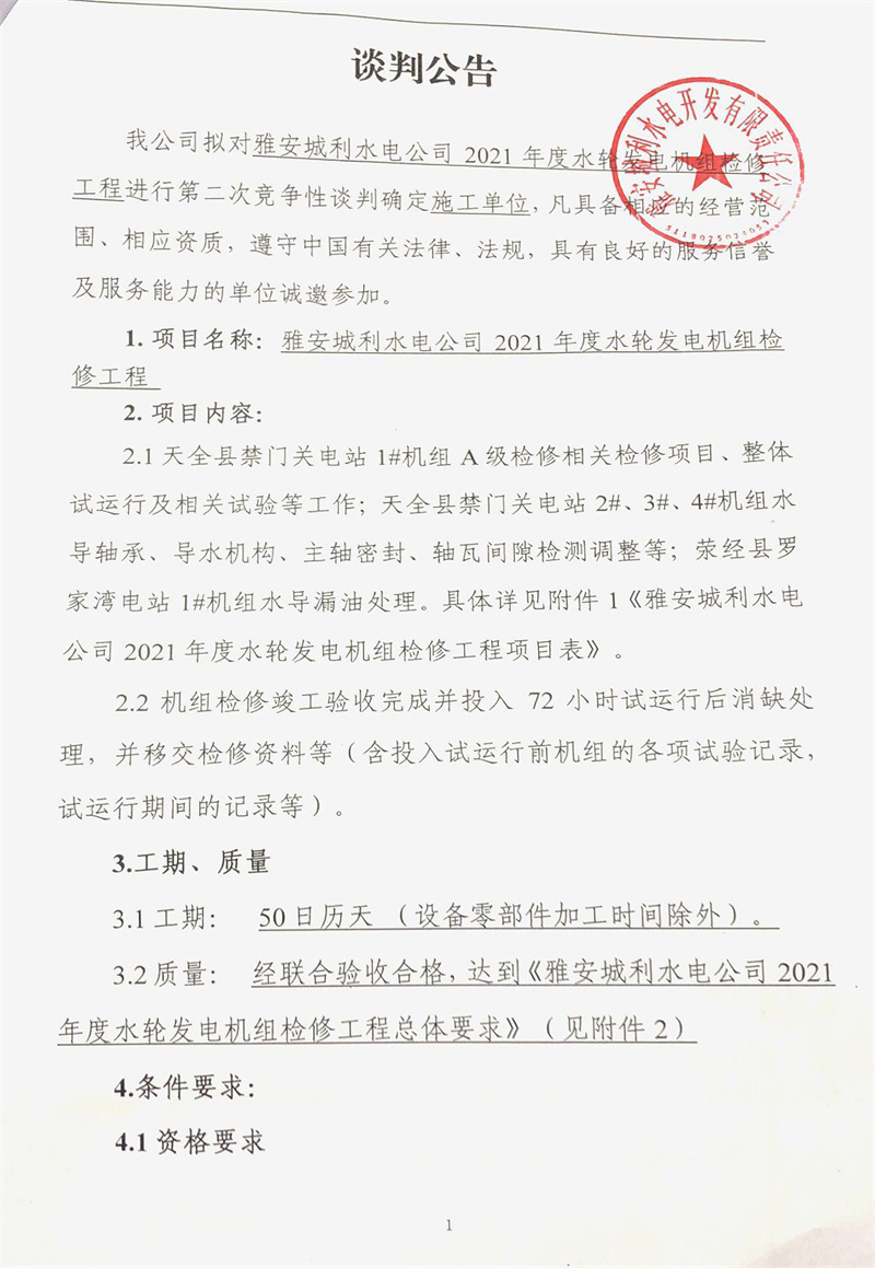 雅安城利水電公司2021年度水輪發(fā)電機(jī)組檢修工程競(jìng)爭(zhēng)性談判公告(第二次)