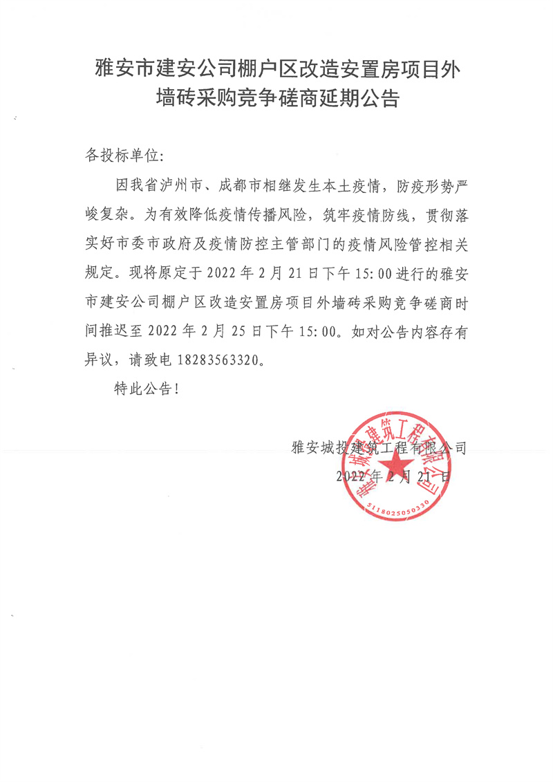 雅安市建安公司棚戶區(qū)改造安置房項(xiàng)目外墻磚采購(gòu)競(jìng)爭(zhēng)磋商延期公告