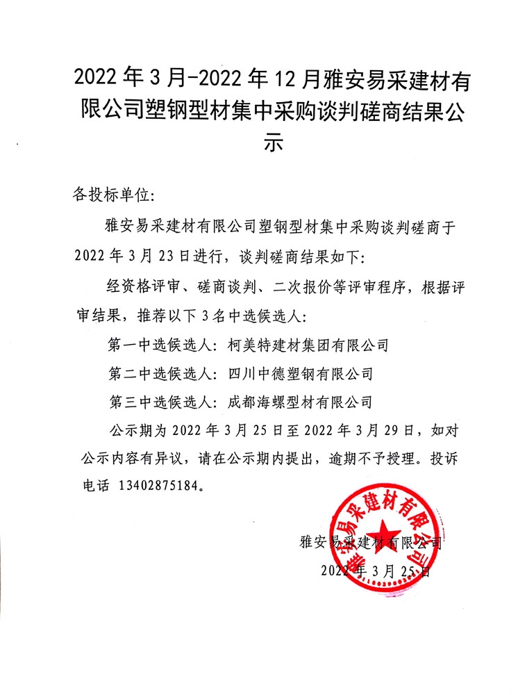 2022年3月-2022年12月雅安易采建材有限公司塑鋼型材談判磋商結(jié)果公示