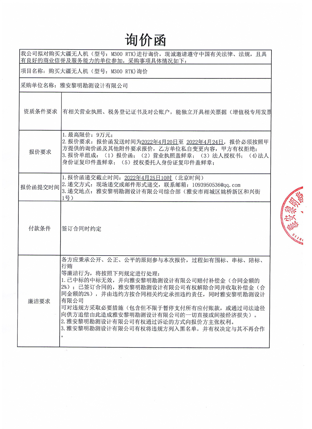 黎明勘測公司購買大疆無人機(jī)(型號:M300 RTK)詢價(jià)函