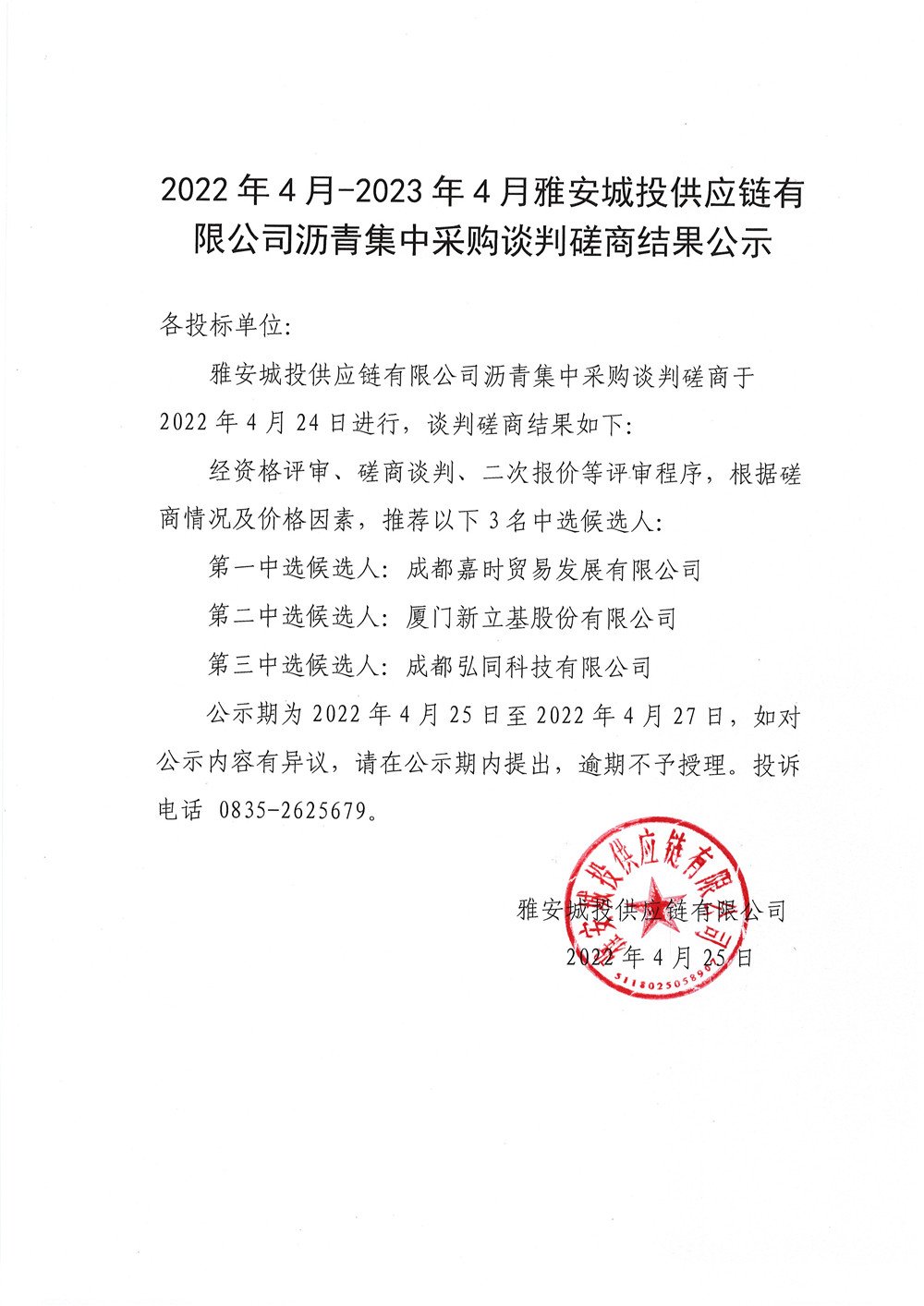 2022年4月-2023年4月雅安城投供應鏈有限公司瀝青談判磋商結果公示
