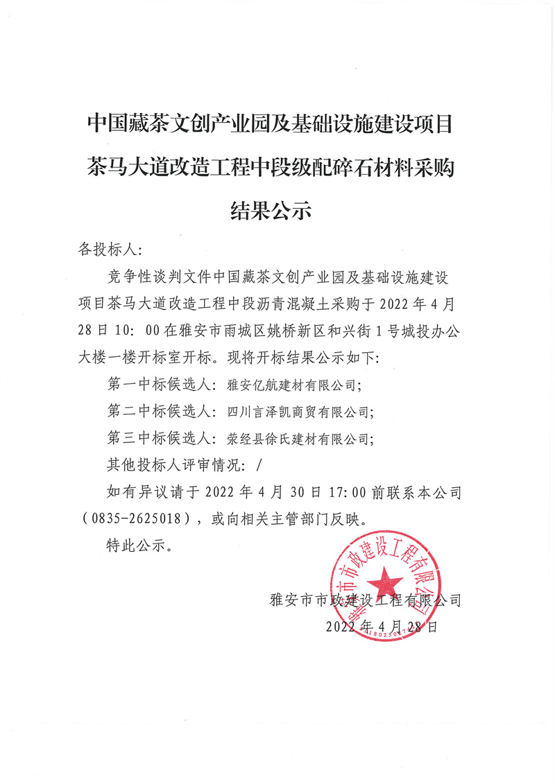 中國藏茶文創(chuàng)產業(yè)園及基礎設施建設項目茶馬大道改造工程中段級配碎石材料采購結果公示