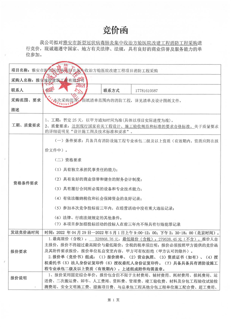 雅安市新型冠狀病毒肺炎集中收治方艙醫(yī)院改建工程項目消防工程采購競價公告