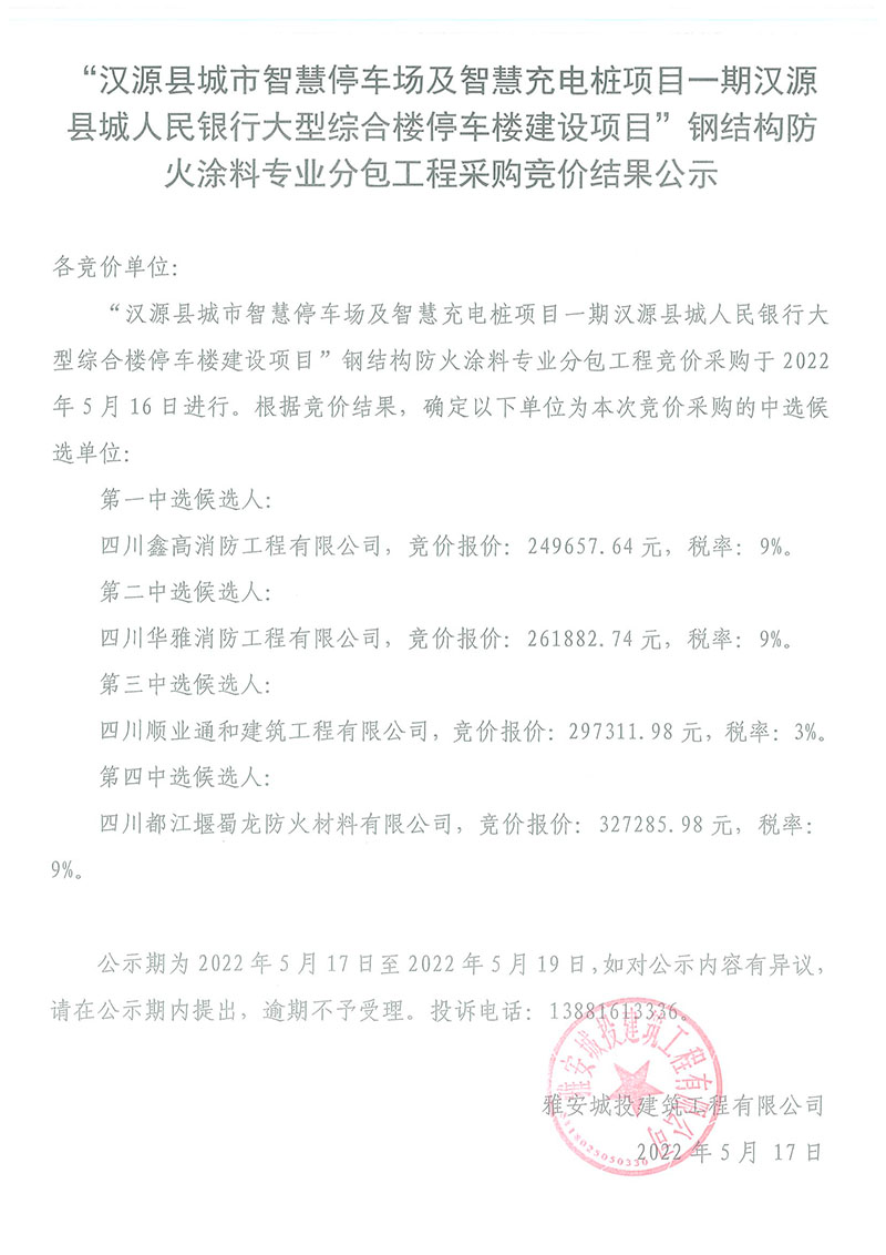 漢源縣城市智慧停車場及智慧充電樁項目一期漢源縣城人民銀行大型綜合樓停車樓建設項目防火涂料專業(yè)分包工程采購競價結(jié)果公示