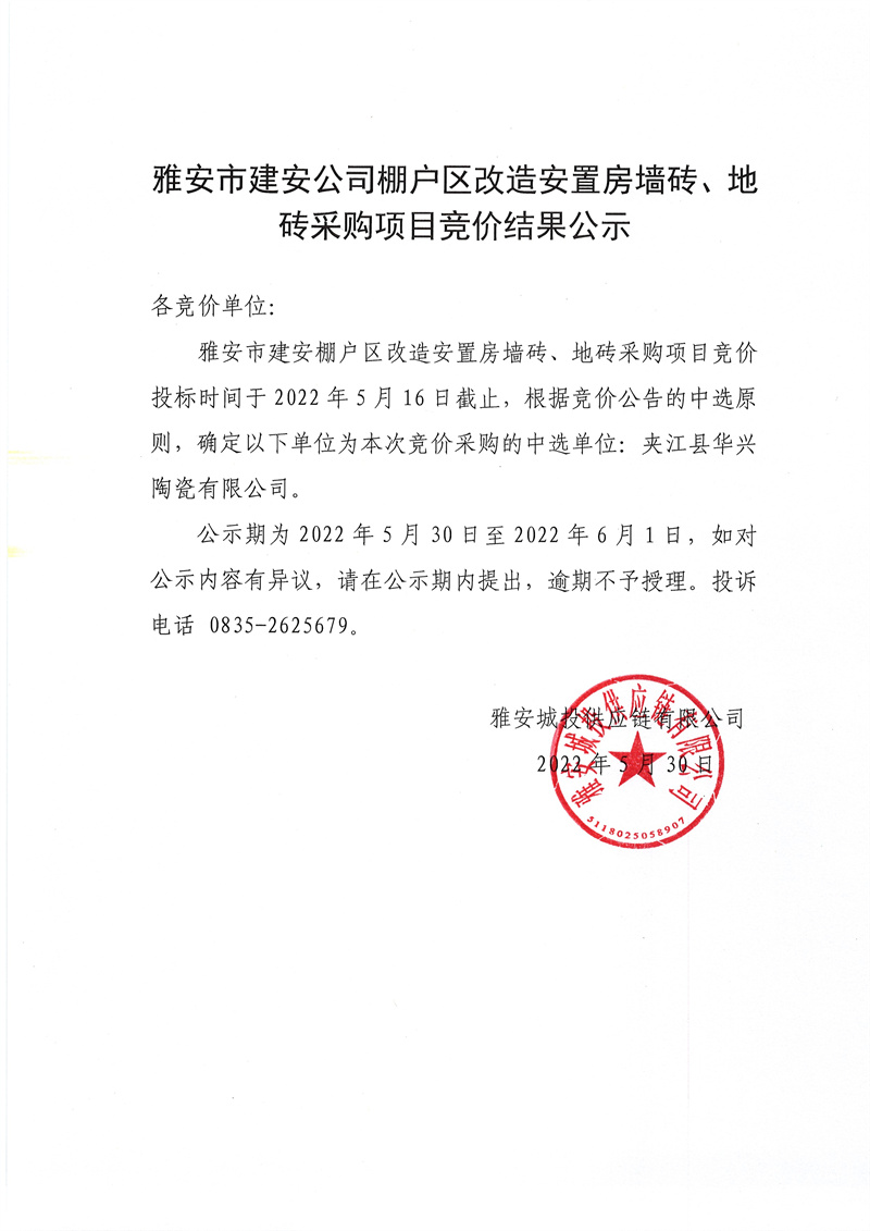 雅安市建安公司棚戶區(qū)改造安置房墻磚、地磚采購競價(jià)項(xiàng)目競價(jià)結(jié)果公示