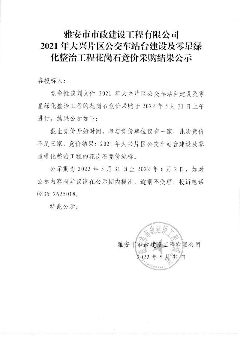雅安市2021年大興片區(qū)公交車站臺(tái)建設(shè)及零星綠化整治工程項(xiàng)目花崗石材料競(jìng)價(jià)采購(gòu)結(jié)果公示
