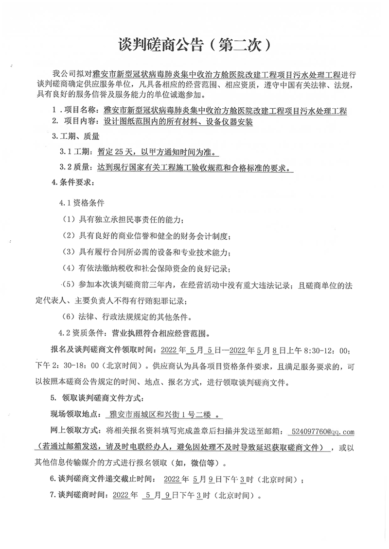 雅安市新型冠狀病毒肺炎集中收治方艙醫(yī)院改建工程項目污水處理工程談判磋商(第二次)