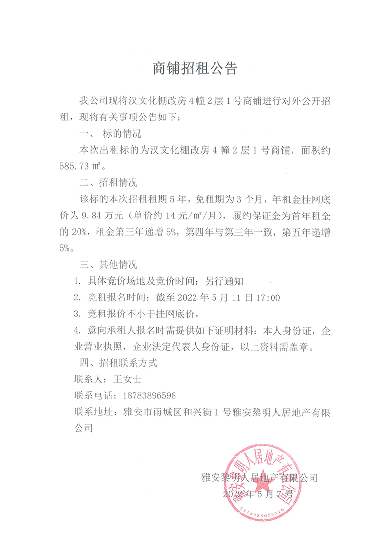 漢文化棚改房4幢2層1號商鋪招租公告