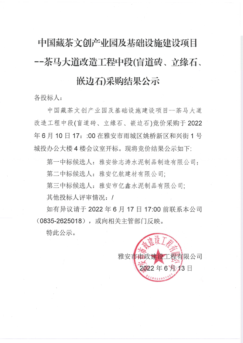 中國藏茶文創(chuàng)產(chǎn)業(yè)園及基礎設施建設項 茶馬大道改造工程中段盲道磚、混凝土嵌邊石采購結(jié)果公示
