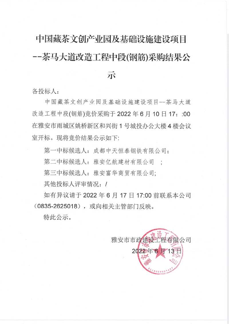 中國藏茶文創(chuàng)產業(yè)園及基礎設施建設項 茶馬大道改造工程中段鋼筋采購結果公示